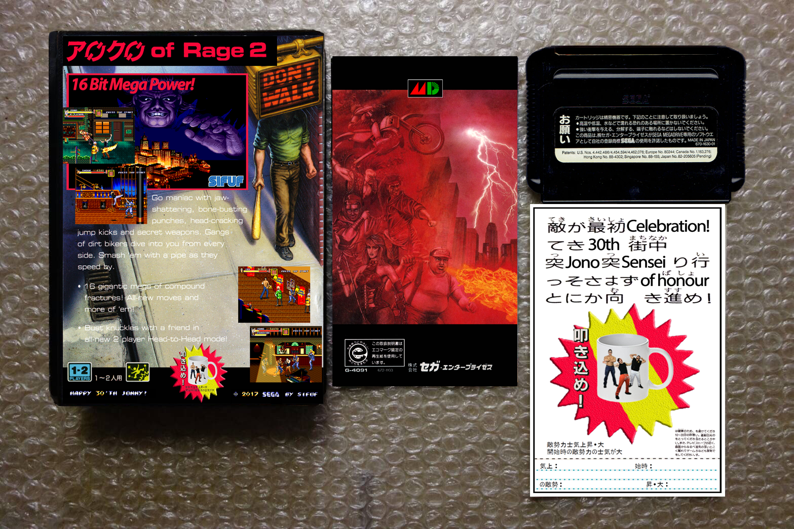 Streets of Rage 2 (Sega Megadrive/Genesis) ROM hack that replaces characters with my brother and friends. Sprites captured and rotoscoped from full motion video. This is a physical release that runs on real hardware, and comes with everything an authentic Japanese Megadrive game would have. Box, manual, registration card, and cartridge