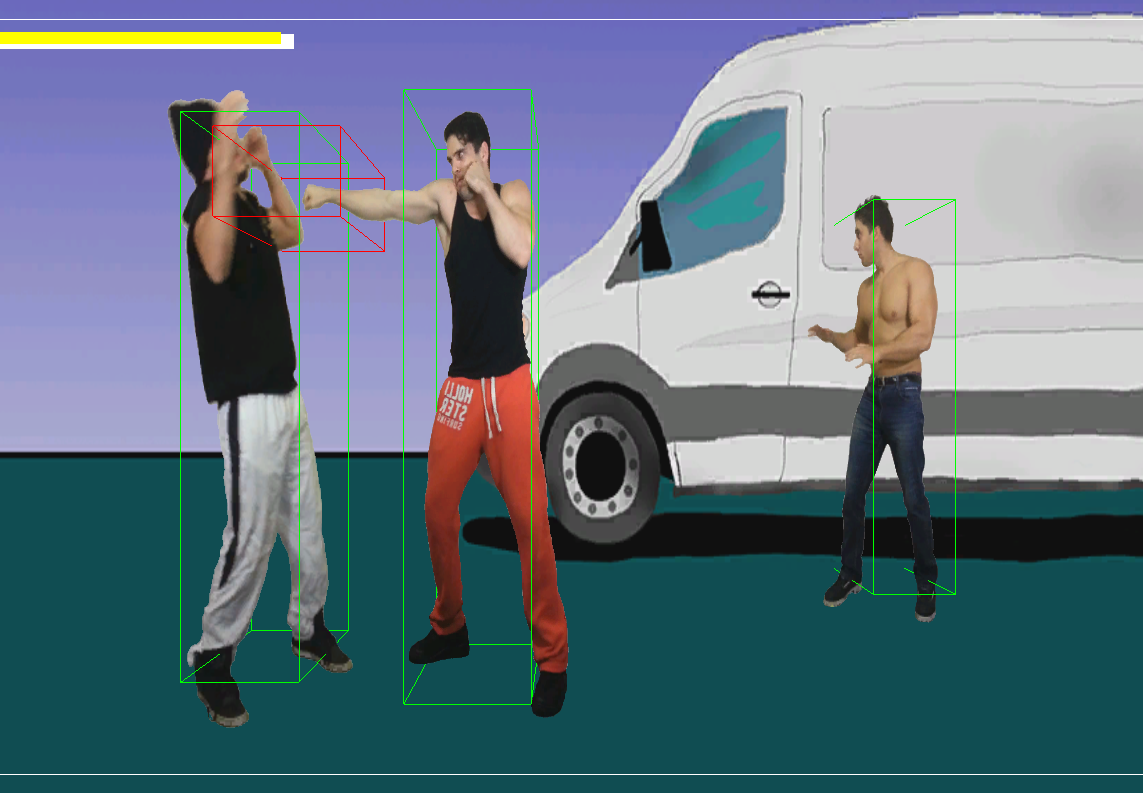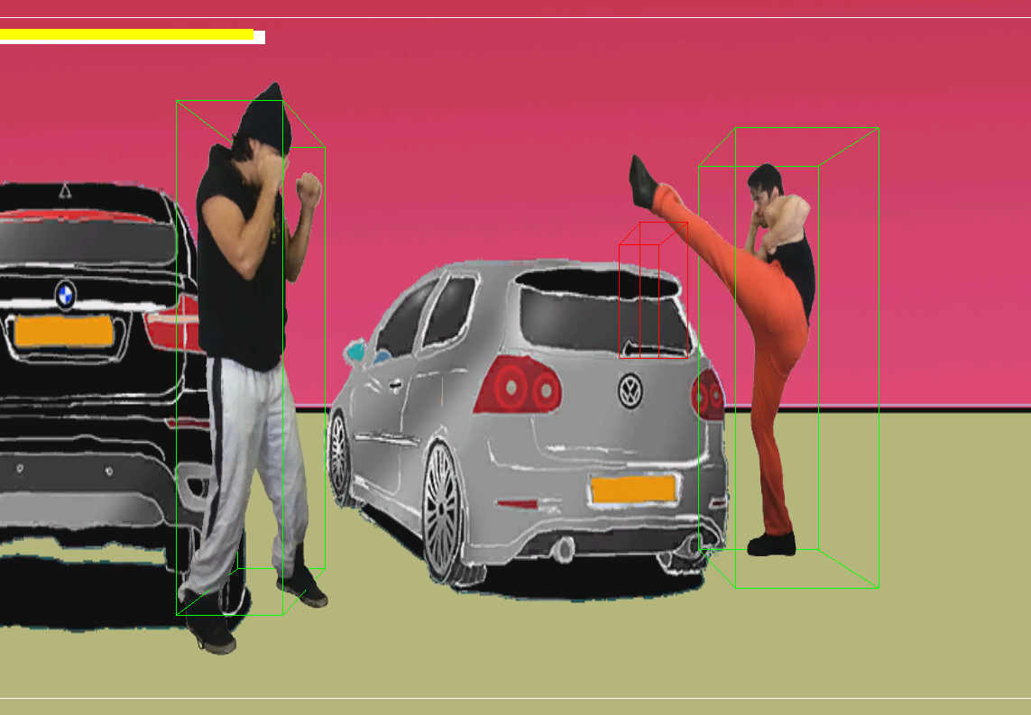 2.5D side scrolling beat em up engine. Written from scratch in C++/OpenGL. Green-screen captured charcters with large moveset (combos, damage, grabs, acrobatics, weapon use, etc..), hand drawn backgrounds, fully animated destructable vehicles