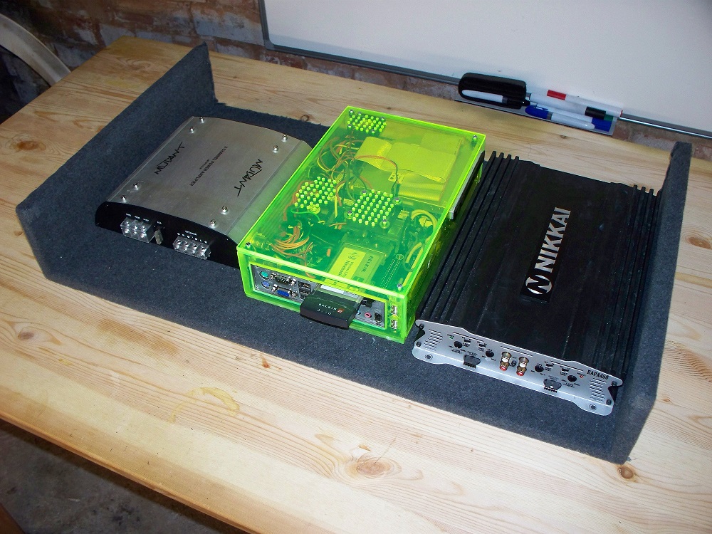 installed in boot via carpeted MDF suspended shelf. PSU is a 12V ATX